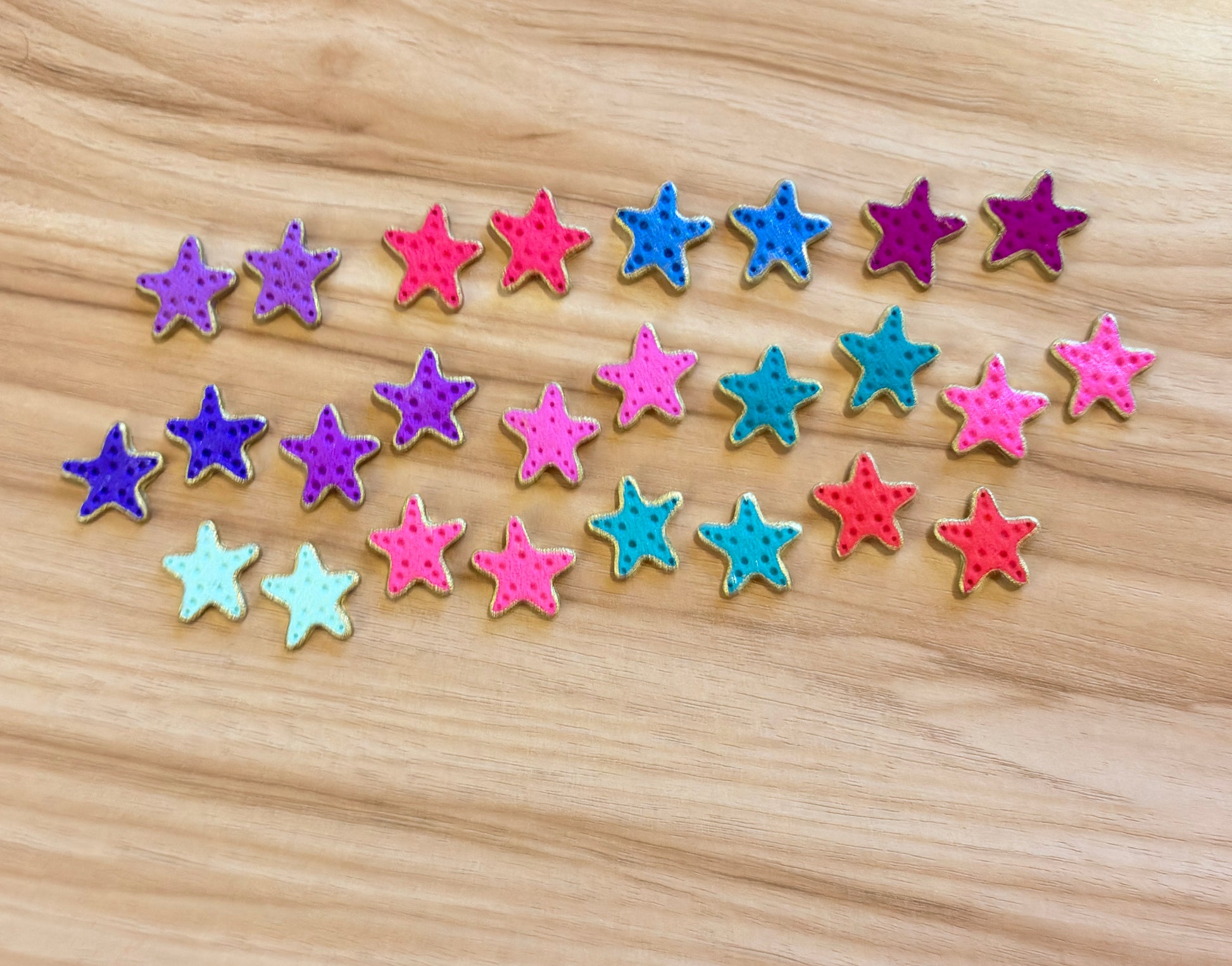 Colourful starfish studs. Gold paint detail, hypoallergenic stainless steel studs, silicone backing.